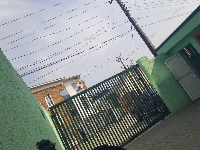 A slightly tilted photographic image captures a residential or commercial street scene in Igboefon, Nigeria, under an overcast sky. The foreground is dominated by a light green textured wall on the left, which angles towards a dark green metal gate with vertical bars. To the right of the gate, a section of a matching light green building features a closed, light-colored metal door within a brown frame. A dark, small fixture is affixed to the lower left wall. Overhead, multiple black electrical wires traverse the sky, supported by a prominent dark utility pole on the right, and another smaller pole in the background. Through the gate's slats, a multi-story building with a brown brick base and white upper levels, equipped with windows and balconies, is partially visible. A dark vehicle is obscured behind the gate. The ground surface in the lower right consists of light-colored paving stones. No individuals or active interactions are present in the scene.