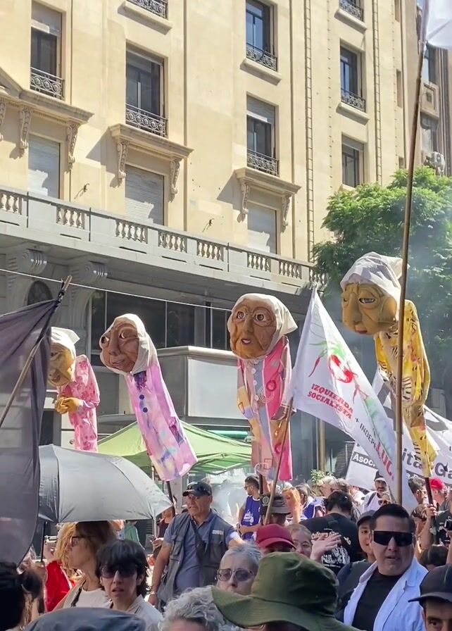 A crowd of people are marching in a city street during the day. They are holding flags and giant puppets depicting people in nightclothes. The puppets each have a headscarf. There are tall buildings on either side of the street. The overall atmosphere appears to be that of a protest or demonstration.
