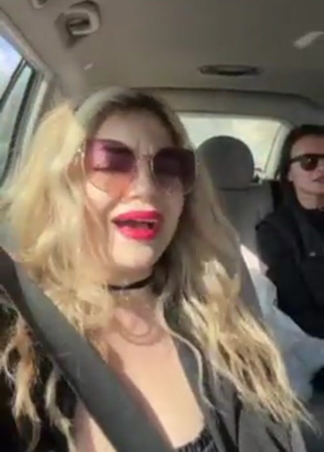Two women are in a car. The woman in the front passenger seat is singing along to music. She has blonde hair and is wearing pink-tinted sunglasses, a black top, and a black choker. She is also wearing red lipstick. The woman in the back seat has brown hair and is also wearing sunglasses. The car is moving, and trees can be seen through the windows.