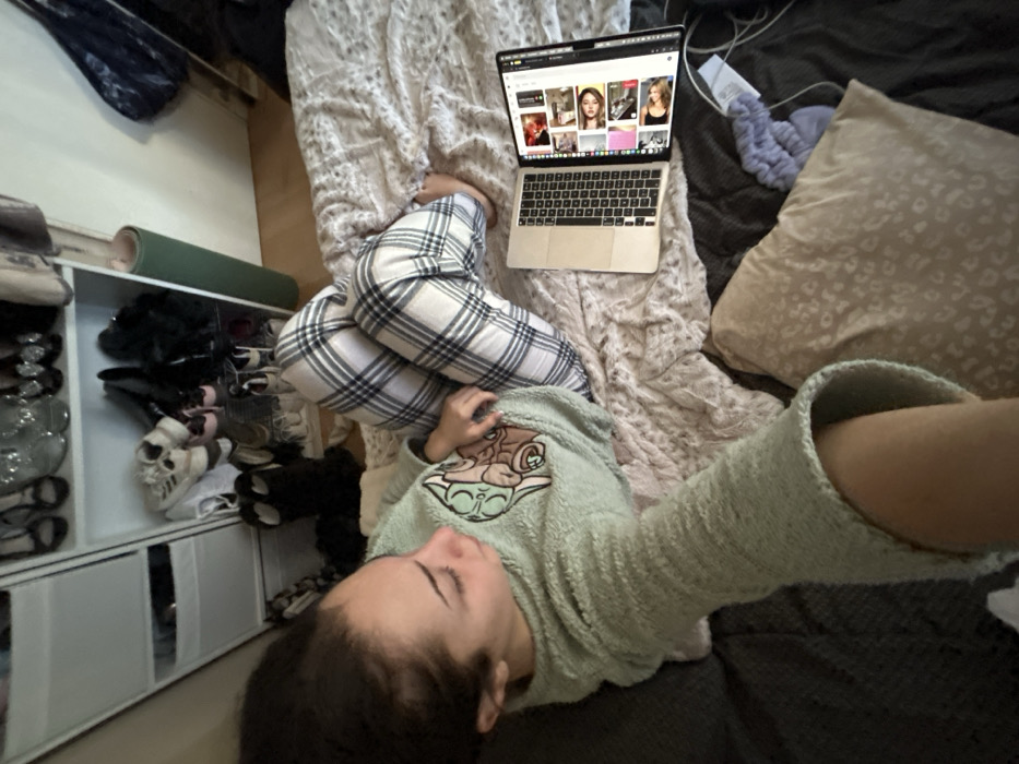 A female individual is depicted lying on her left side on a bed in a bedroom located in Schiltigheim, France. She wears a light green, fuzzy long-sleeved top featuring a stylized pattern on the chest and light-colored plaid pajama pants. Her dark hair is pulled back, and her gaze is directed towards a laptop positioned on the bed to her right. Her left arm is extended towards the camera, indicating a self-portrait. The laptop, a silver model, is open and displays a grid of multiple small images on its screen. The bed is covered with textured light-colored bedding, partially revealing a darker grey sheet or blanket underneath, and two pillows are present. In the background, a white shelving unit is visible, filled with numerous pairs of shoes, including high heels, sneakers, and boots, on its shelves and base. To the right of the shelving unit, a rolled-up green mat leans against a light-colored wall. A dark garment or bag hangs on the far right. The floor appears to be light-colored wood.