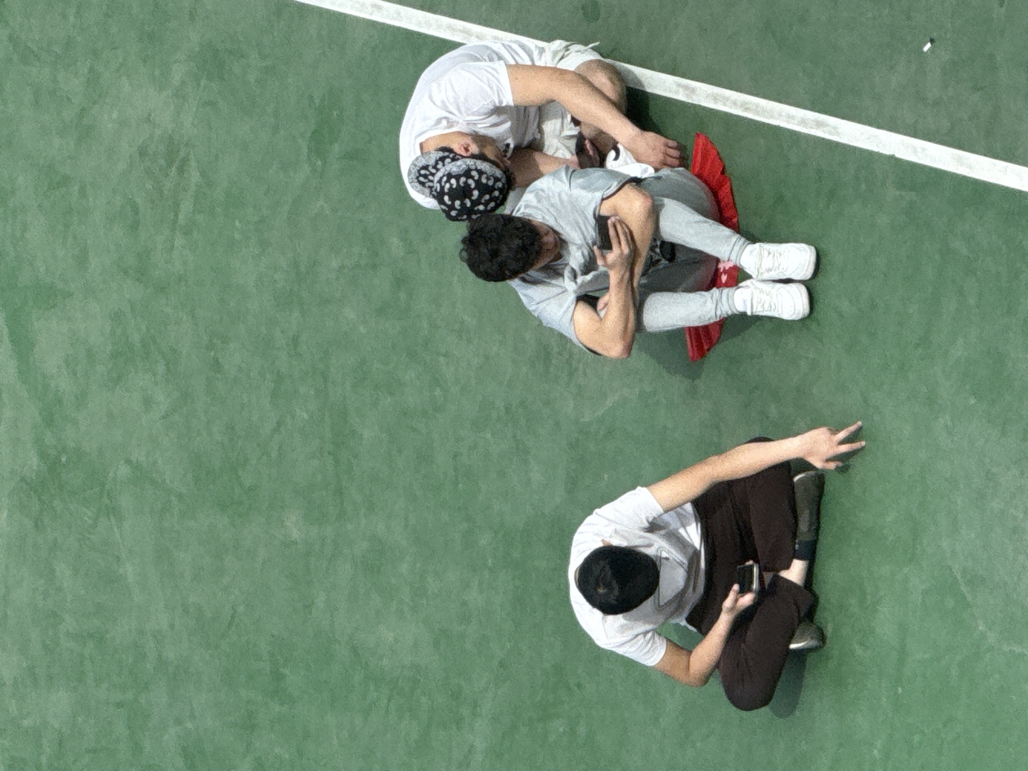 Three male subjects are depicted resting on a green-surfaced outdoor court within Daxing District, China. A single white court line runs vertically along the right side of the frame, bordering the area where two of the subjects are positioned. Subject 1 (left) is seated cross-legged, wearing a white short-sleeved t-shirt with a dark emblem, dark trousers, and a dark cap worn backward. He holds a black smartphone in both hands, positioned in his lap, while looking downwards. His right hand's index and middle fingers are extended and touching the ground. Subject 2 (center) is seated on a folded red fabric item, wearing a light grey short-sleeved t-shirt, light grey trousers, and white athletic shoes. He is hunched forward with his arms crossed over his knees, holding a black smartphone, also looking downwards. Subject 3 (right) is seated immediately adjacent to Subject 2 and the white court line. He is dressed in a white short-sleeved t-shirt, white shorts, and white athletic shoes. A black-and-white patterned bandana or head covering is worn on his head. His posture suggests leaning back slightly or resting against the court surface. All subjects appear to be in a state of repose.