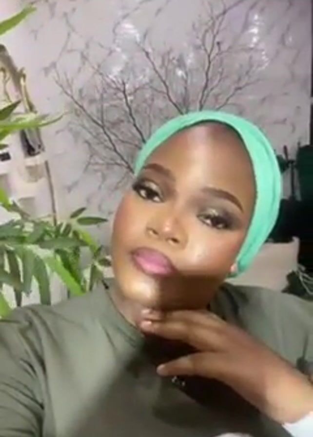 A medium shot captures a woman wearing a green headscarf and a matching green t-shirt