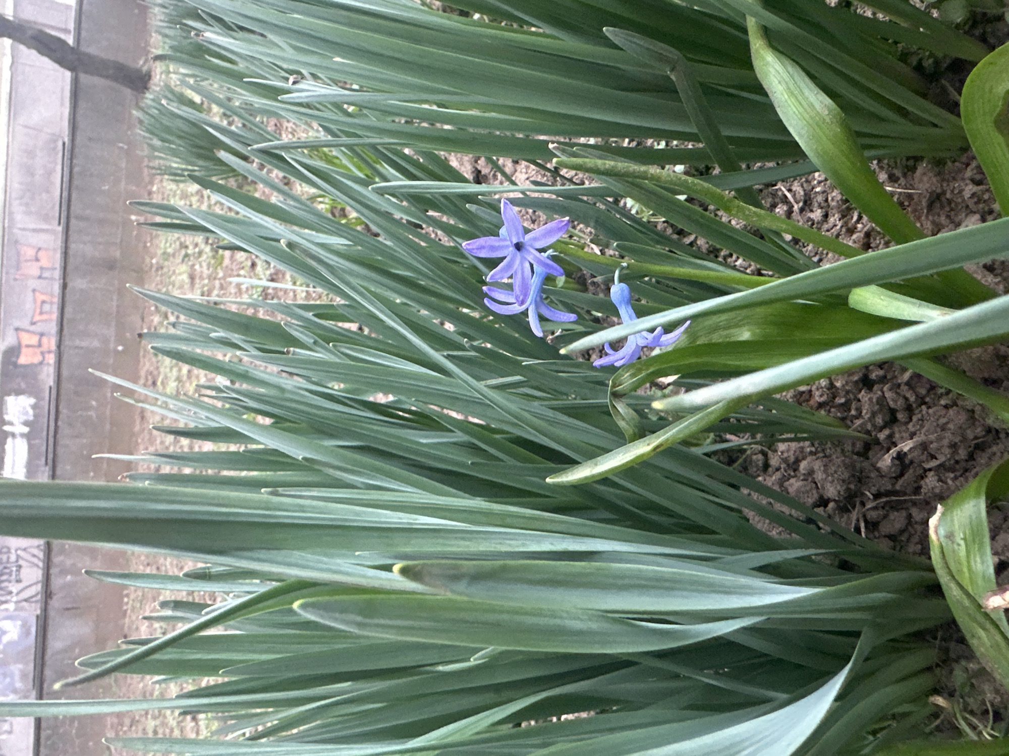 The scene captures a close-up, low-angle perspective of a garden bed, set within an urban context in Sofia, Bulgaria. The foreground and midground feature a dense growth of vibrant green, strap-like foliage from numerous bulbous plants. Among these leaves, two clusters of small, star-shaped, purple-blue flowers are visible: a prominent cluster with multiple open florets is positioned towards the center-right, and a smaller cluster of partially open florets is located lower-left. The plants are rooted in dark brown, clumpy soil. The background reveals a light gray concrete wall, exhibiting faint orange-brown graffiti along its upper edge. Beyond the wall, sparse groundcover and the visible trunk of a dark tree are discernible on the right side. The overall lighting is diffuse, indicative of an overcast sky. No individuals, animals, or specific interactions are depicted. The exact geographical coordinates within Sofia, Bulgaria, are not discernible from the visual data.