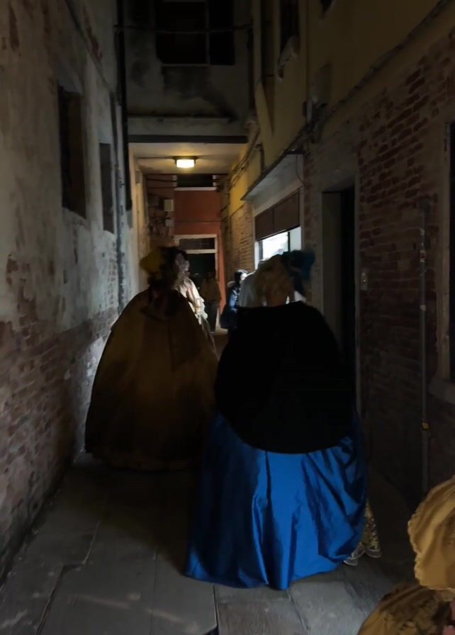 group of people walking through a narrow alleyway. The alleyway has brick walls and a stone path. The people are dressed in elaborate costumes, including long gowns and capes. Some people in the alleyway are looking at the contents of a shop window. The lighting is dim, and the scene appears to be taking place at night.