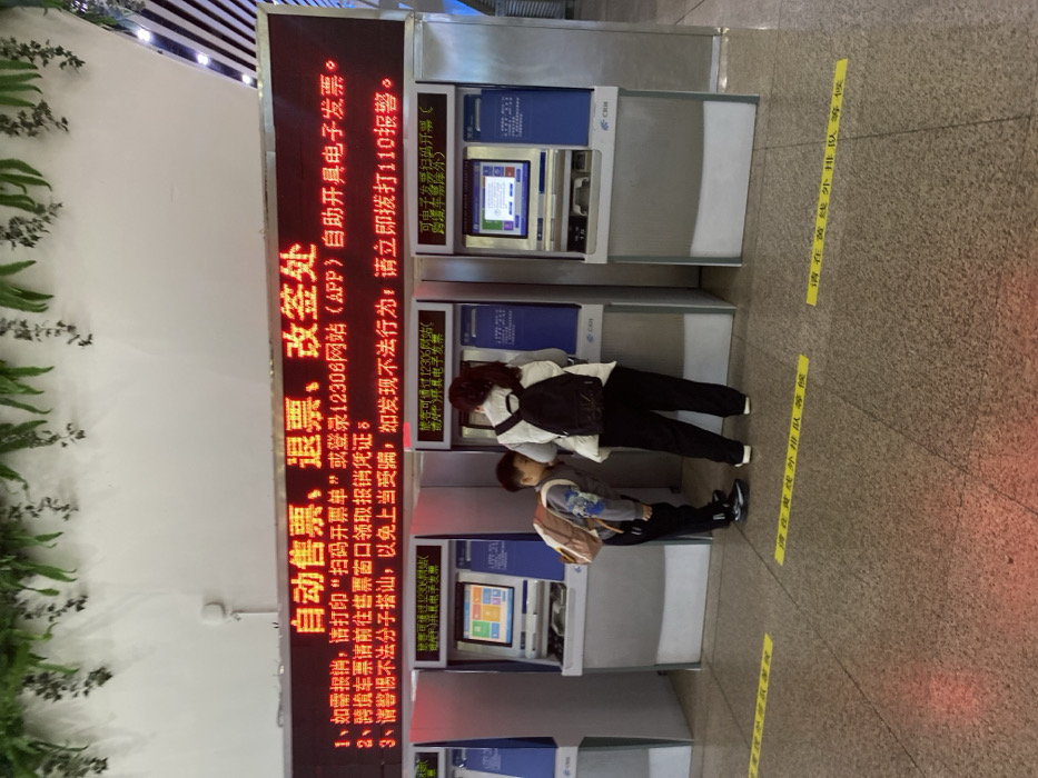 utomated ticket vending machines at a train station. A sign reads "Automatic ticket sales, refunds, modifications". It cautions users to be wary of strangers offering help to avoid scams, and to dial 110 (the police) if they observe illegal activity. It also provides instructions on how to obtain receipts for reimbursement using the 12306 website or app. Two people are using the machines. Yellow lines on the floor demarcate waiting areas.