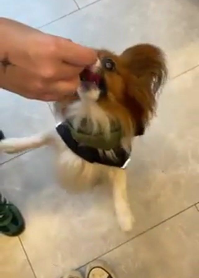 A hand is offering a treat to a small, white and brown Papillon dog wearing a black vest with a green collar on a gray tiled floor