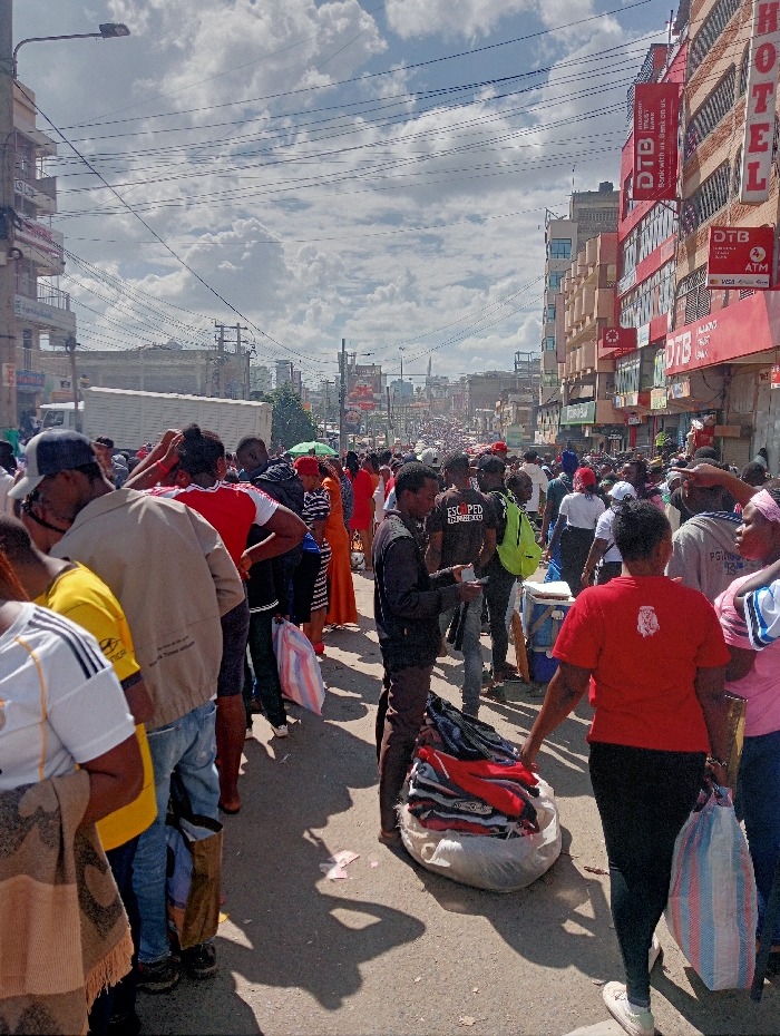 A crowded street scene showcases a bustling urban environment. Pedestrians fill the space, moving in various directions amidst buildings adorned with signs and advertisements. A man stands beside a large bag filled with clothes. Overhanging electrical wires crisscross the sky. Buildings with the branding DTB and mentions of "Hotel" and "ATM" are visible. The sky is filled with clouds, casting shadows on the street. Overall, the image conveys the energy and activity of a busy city street.