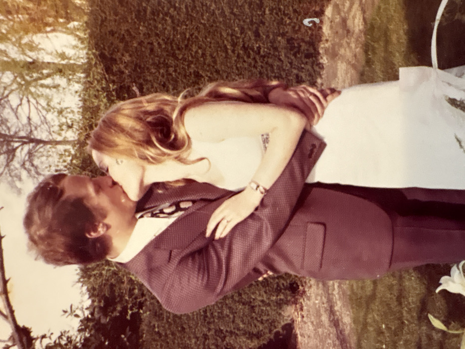 An outdoor color photograph, exhibiting vintage coloration, depicts an adult male and female embracing and kissing