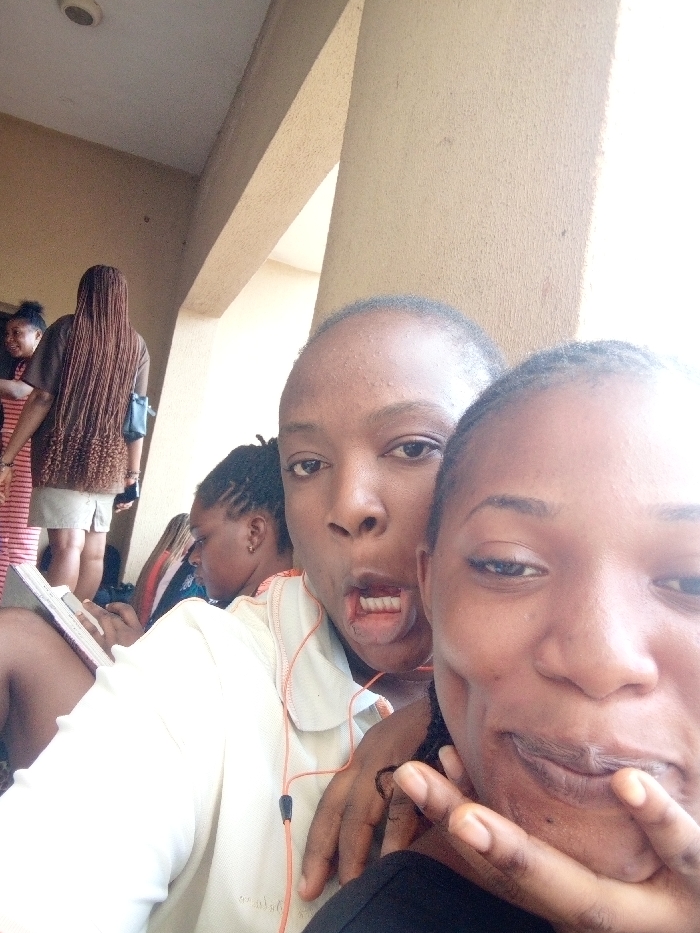 This image depicts five Black individuals within an interior or semi-exterior space in Nsugbe, Nigeria, characterized by light-beige walls and architectural structures. In the immediate foreground, two young women are prominent. The woman on the left, with dark, short hair and a light-colored collared shirt, displays a playful facial expression with an open mouth, partially extended tongue, and visible teeth. Orange wired earbuds are draped around her neck. Her right hand rests on the shoulder of the adjacent woman. The woman on the right, partially visible from the nose down, exhibits a subtle smile, with her right hand covering her chin and mouth; she wears a dark top. In the mid-ground, a third woman, observed in profile, is seated and engaged in writing or reading from an open book or notebook. Her hair is braided. Further in the background, a fourth woman stands with her back to the viewer, showcasing long, brown box braids. She wears a dark shirt, light shorts, and a dark cross-body bag. A fifth woman is partially visible on the far left, wearing a striped top. The background includes a beige-colored structural pillar and a ceiling with a circular light fixture.