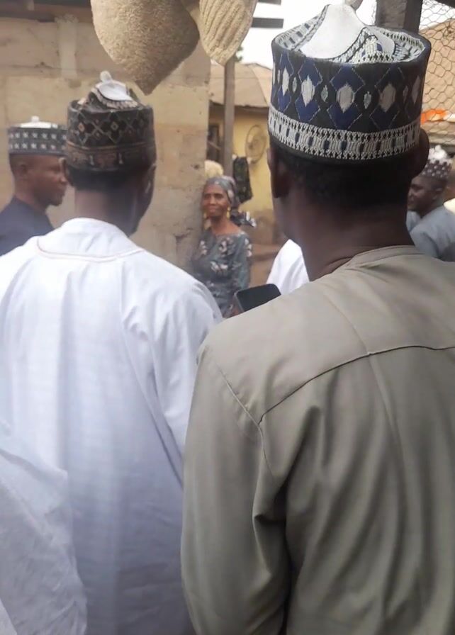 A group of men wearing traditional clothing and caps are standing and sitting together. One man is taking pictures or video with a phone. The environment appears to be an outdoor space near a wall.