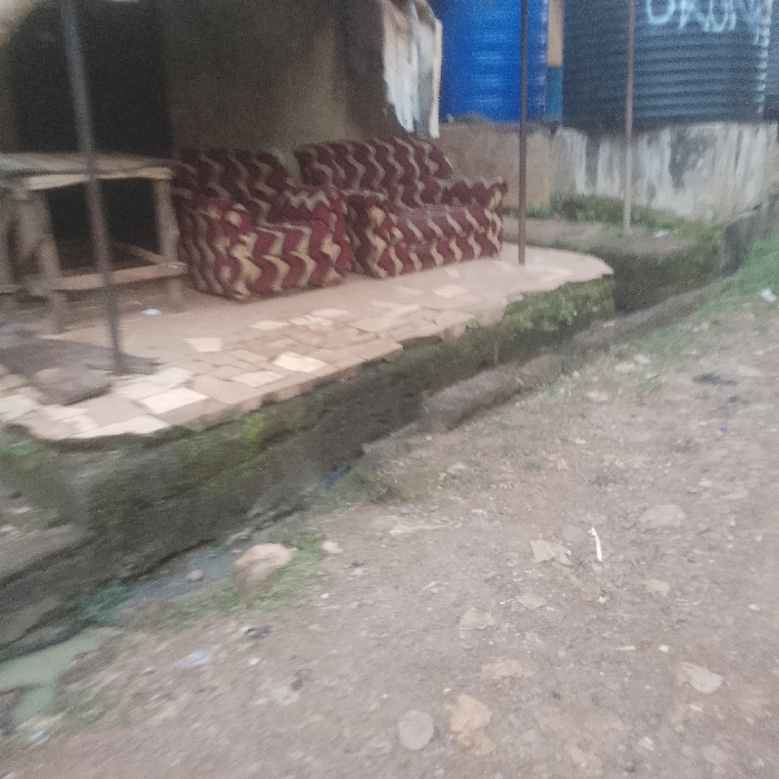 The image displays an exterior scene within an unidentifiable urban environment. The foreground consists of an unpaved, dirt and gravel ground surface containing scattered debris. A concrete-lined drainage channel, holding shallow murky water and exhibiting moss growth, traverses the mid-ground horizontally. Above this channel, a raised platform is present, surfaced with light-colored, rectangular pavers. Positioned on this platform are two identical upholstered sofas, each featuring a distinct reddish-brown and beige zig-zag pattern. To the left of the sofas, a simple wooden-framed table or stand is partially visible. The background reveals a building structure, from which light-colored fabric hangs. To the right, a tall blue plastic barrel and a dark-colored tank with partial white graffiti, reading "DAD," are visible. Two slender metal poles extend vertically within the scene. No individuals are present.