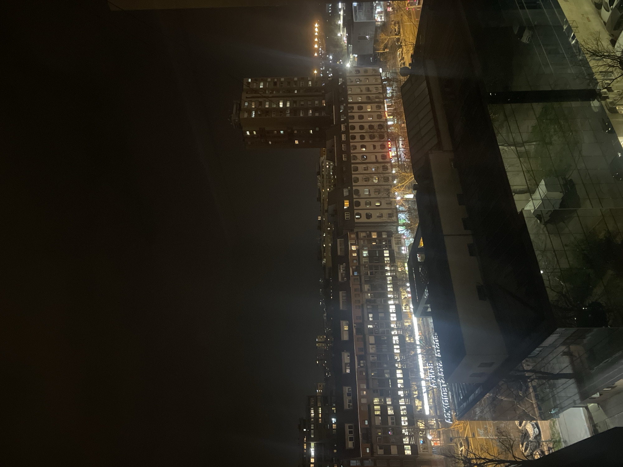 The image displays an urban cityscape in Novi Sad, Serbia, at night, viewed from an elevated perspective. The scene is characterized by pervasive artificial lighting against a dark, featureless sky. In the immediate foreground, a dark, reflective glass facade of a building captures reflections of bare deciduous trees and various light sources. Immediately below this, a street is visible with multiple parked vehicles. A prominently illuminated sign, reflected on the glass facade, identifies a building as "БАНКА ПОШТАНСКА ШТЕДИОНИЦА" (Bank Post Office Savings Bank), located in the vicinity of Trg Galerija 1, Novi Sad. The midground features several multi-story residential and commercial buildings, many with illuminated windows. In the background, a distinct tall residential tower is visible on the right, surrounded by further city lights extending towards the horizon. No human figures or specific dynamic actions are discernible within the frame.