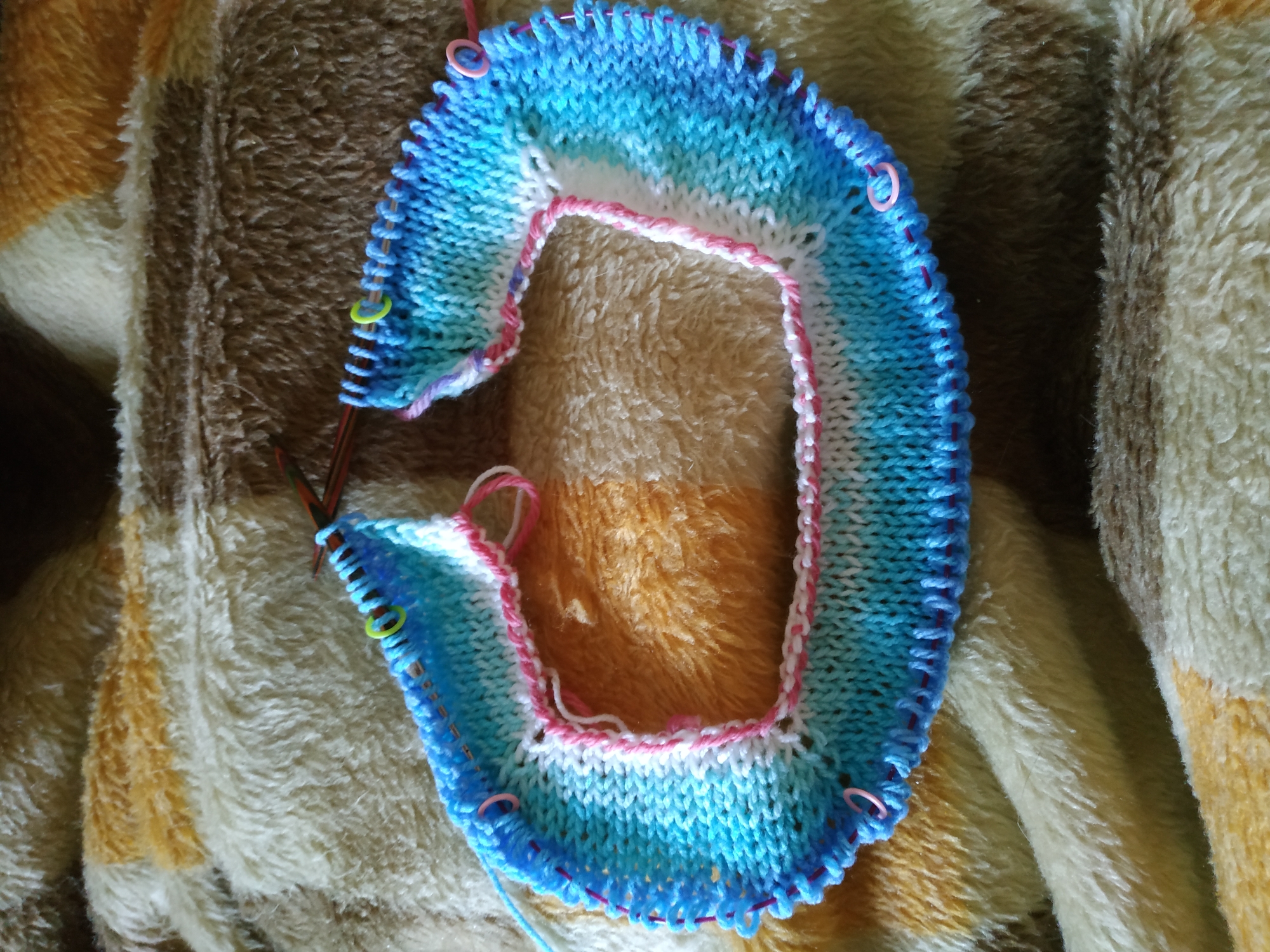 A partially completed knitting project rests on a patterned, soft blanket or throw. The knitting appears to be circular, forming a sort of ring or tube. The main yarn color transitions from blue to white, with some light blue variations. The knitting uses stitch markers and the live stitches are on knitting needles. The inner edge of the knitting is finished with a row of pink and white yarn. The blanket has a light color scheme with brown, beige and yellow sections. The location is not present in the image.