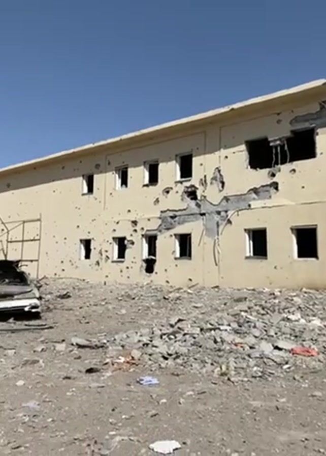 aftermath of an explosion in what appears to be a war-torn area. A two-story building is visible with extensive bullet holes and structural damage. Debris and rubble cover the ground in front of the building. A white car, severely damaged and burnt, sits amidst the wreckage. There are no people visible in the video. The sky is clear and blue.