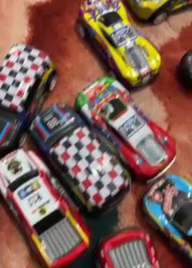 A collection of colorful, toy race cars are scattered on a fuzzy rug with a multicolored geometric pattern. The cars have various designs, some featuring checkerboard patterns, racing numbers, and rescue-themed graphics. Several cars are flipped upside down, revealing their black chassis and wheels. The camera focuses on the cars, and then zooms in on the bottom of one of the cars. A child's voice can be heard in the background.