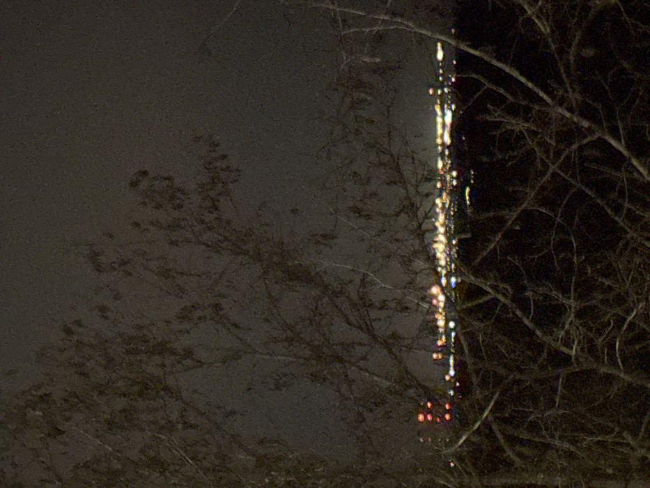 The image depicts a distant cityscape at night, viewed from an elevated position within the city of Törökbálint, Hungary. The foreground is dominated by the dark, silhouetted branches of deciduous trees, largely bare of leaves, extending across the lower two-thirds of the frame. The branches, appearing to belong to multiple trees, are intricately intertwined. Beyond the immediate foreground, a dark, indistinct landscape stretches towards the horizon. In the background, a horizontal band of blurred, multicolored artificial lights signifies a distant urban area. These lights are predominantly yellowish-white, with several distinct clusters of red lights visible towards the left. The sky above the cityscape is dark and overcast, showing significant visual noise indicative of low-light photographic conditions. No individuals, specific objects beyond the trees and lights, or discernible actions or interactions are present in the frame.
