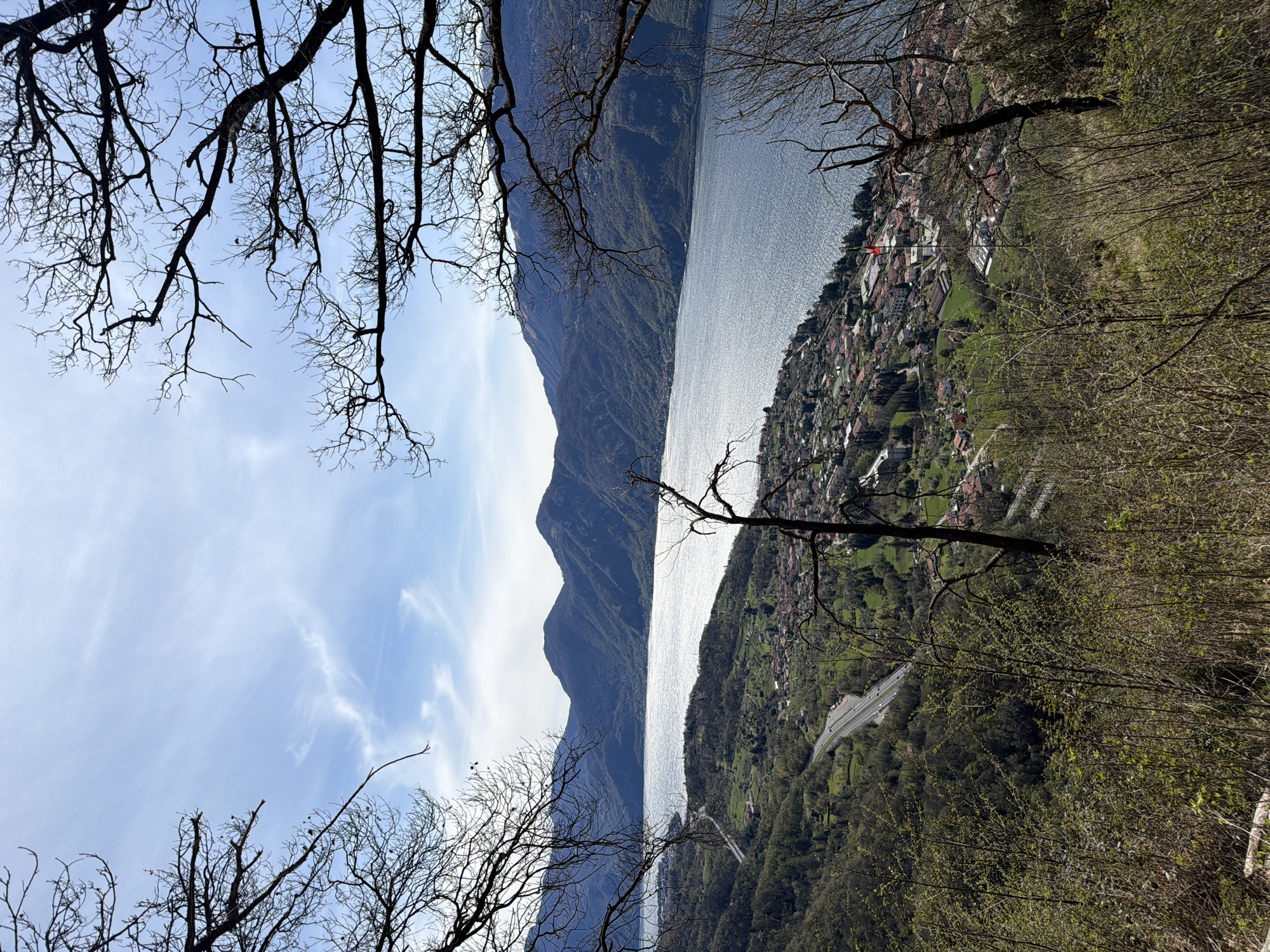view from a high vantage point overlooking Lake Como in Lierna, Italy. The lake occupies the center of the frame, its surface reflecting the sunlight. On the right side of the lake, a hillside descends toward the water, dotted with houses and buildings, indicating a town or village. A road winds along the hillside. Mountains rise sharply on the opposite side of the lake. Leafless tree branches frame the top and sides of the view. The sky is blue with scattered clouds.