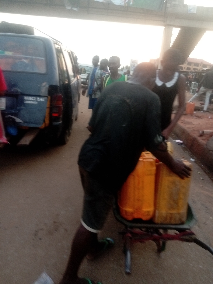 A man wearing a dark t-shirt and shorts pushes a wheelbarrow laden with three yellow jerrycans along a street. The scene features several individuals in the background, including a woman in a black dress with a white collar. A dark-colored van and other vehicles are parked along the road. The lighting suggests either early morning or late afternoon. A building and a bridge are seen in the background.
