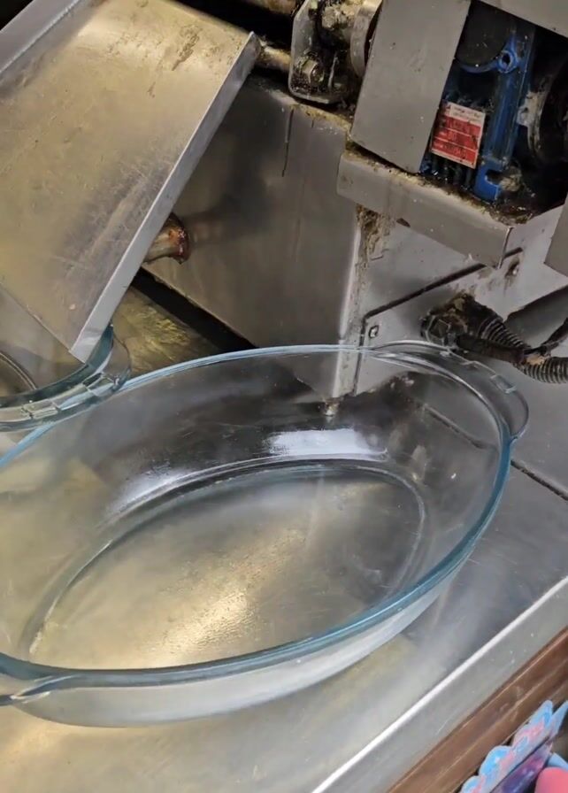 A man operates a donut-making machine on a stainless-steel counter. The machine has a metal hopper and a chute that drops dough into a glass dish. The man uses a spatula to move the donuts into the machine. Behind the machine, a sign displays the word "DONUTS" in both English and another language, along with prices. Toys and a box are on the counter next to the glass dish.