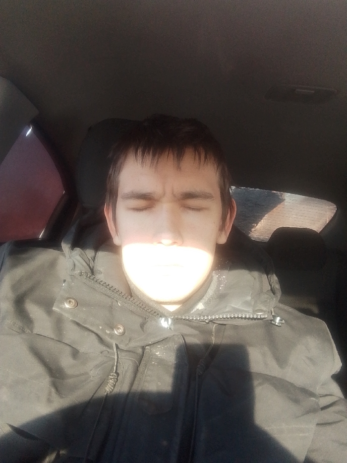 A young adult male, appearing to be in his late teens or early twenties, is depicted from the chest up, seated inside what appears to be a vehicle