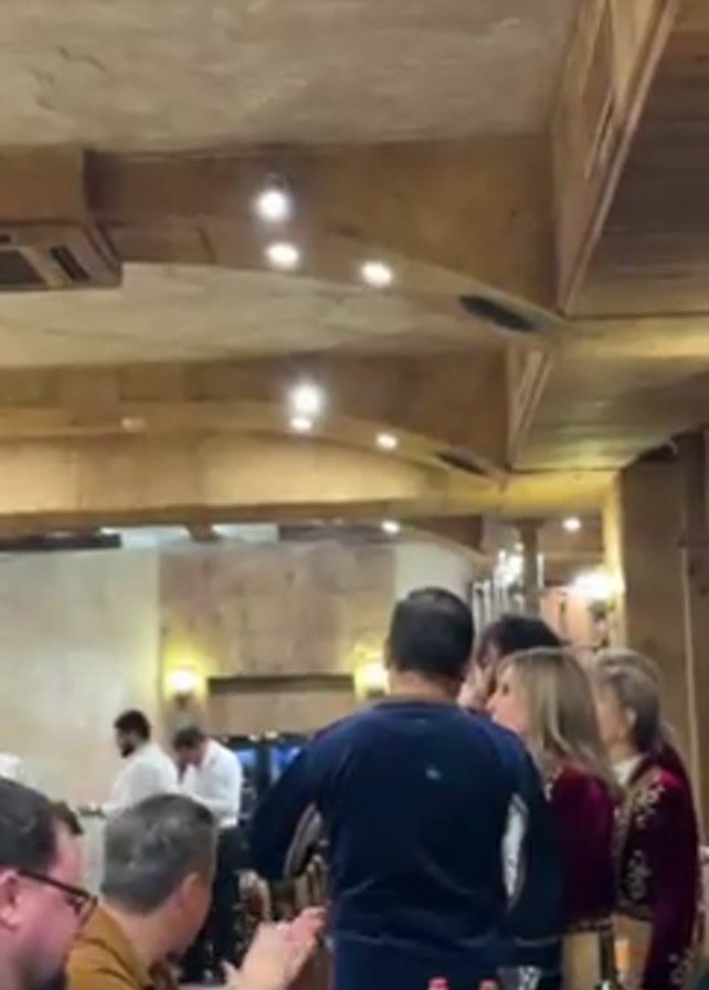 interior of a restaurant, probably during a celebration. There are people seated at tables, and standing near the back. Some are interacting, as though talking to one another. The restaurant has a warm color scheme, and includes ceiling lights and wooden beams. Waitstaff can be seen serving in the background. The camera angle is low, as though taken from someone seated at a table. The overall impression is of a lively social gathering.