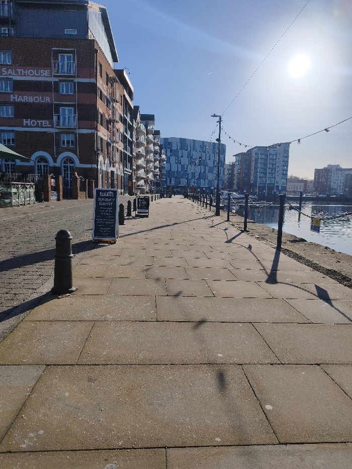 The image depicts a paved waterfront promenade in Ipswich, United Kingdom, specifically along the Ipswich Waterfront. The scene is observed under a clear blue sky with bright sunlight, originating from the upper right, casting long shadows to the left and across the path. On the immediate left, the foreground consists of light-colored rectangular paving slabs. A dark metal bollard stands prominently, casting a long shadow. Further along the left are two A-frame advertising boards on the pavement; the closest one advertises "ISAACS SUNDAY ROAST". Adjacent to the pavement on the left, a multi-story red-brick building with white window frames and balconies is clearly visible, identified by "SALTHOUSE HARBOUR HOTEL" signage. This building is followed by a row of modern residential apartment buildings, also multi-story, featuring white-railed balconies. On the right side of the image, a concrete or stone retaining wall marks the edge of the waterfront. A series of dark metal posts, connected by chains, line the water's edge, with yellow warning signs attached to some. The calm water of the harbor reflects the sky and distant structures. Several boats are docked in the water. The promenade extends into the distance, bordered by string lights with visible bulbs, suspended between dark metal poles, which also cast distinct shadows. In the midground, beyond the initial apartment buildings, a prominent modern structure with a distinctive blue and white patterned facade is visible. Further in the background, additional modern residential or commercial buildings with glass facades line the waterfront, leading to more distant urban structures. No individuals are present in the frame. A faint airplane contrail is visible in the upper sky.
