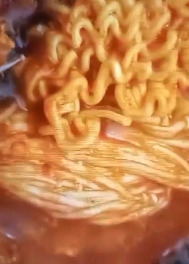 A close-up shot focuses on a dish of ramen noodles with a reddish sauce