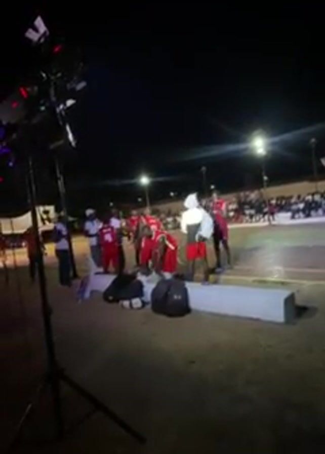 nighttime scene at what appears to be an outdoor sporting event, likely a basketball game