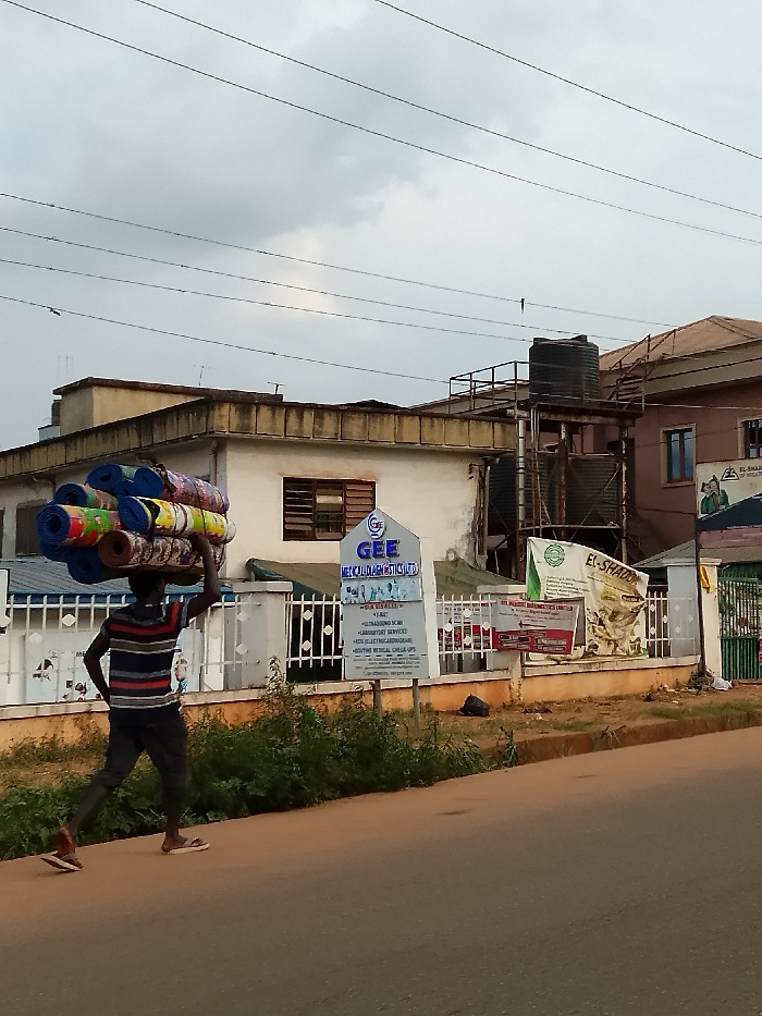 A man walks along a street carrying a bundle of rolled mats on his head. He wears a striped shirt, dark pants, and sandals. Behind him are buildings and signage, including "GEE Medical Diagnostic LTD" and another sign reading "EL-SHADDAI." A water tower sits on a raised platform behind one of the buildings. Power lines stretch across the cloudy sky above.