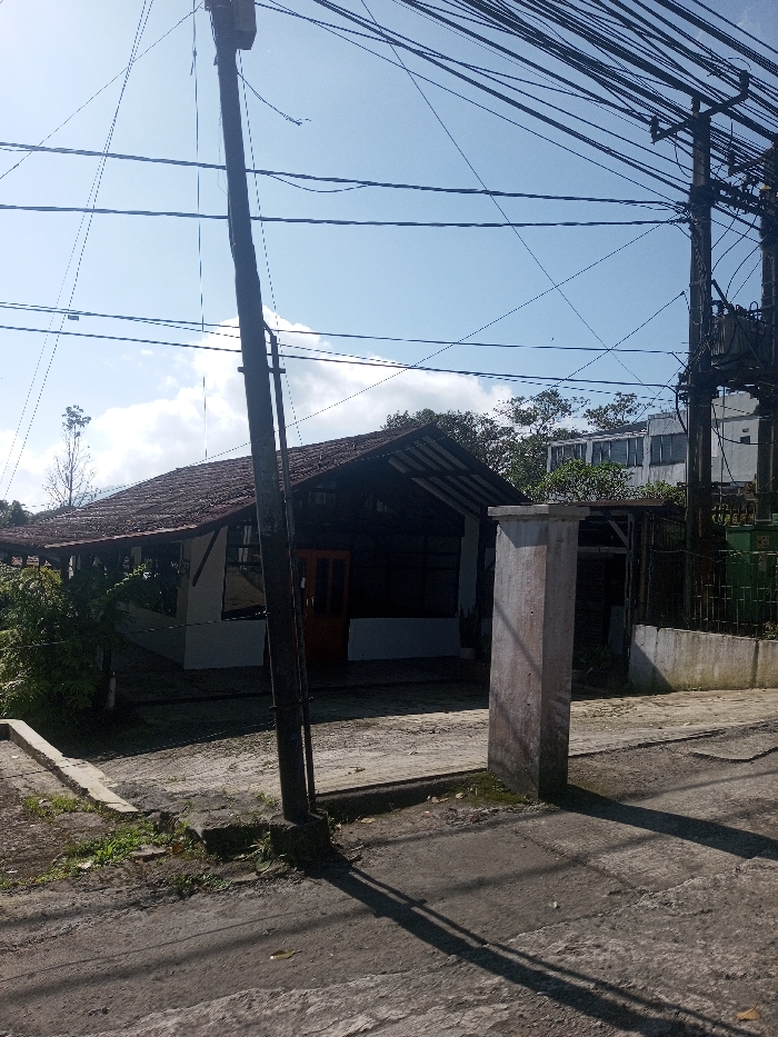 The image depicts an outdoor daytime scene in the city of Niz Lakuk, India, featuring an intersection of utility infrastructure and buildings. In the foreground, a dark utility pole stands prominently on the left, casting a long shadow across a gray, textured paved ground, possibly asphalt or concrete. Multiple black electrical wires extend diagonally from this pole and across the bright blue sky, which contains scattered white clouds. To the right of the foreground pole, a second, thicker utility pole supports a large, dark transformer box, from which a dense network of black wires extends across the upper right portion of the frame. In the mid-ground, a single-story building with a gabled roof covered in dark reddish-brown tiles is situated. The building features white or light-colored lower walls and dark, open-eaves upper sections. A light brown wooden double door is visible on its front facade, flanked by dark rectangular windows. Green foliage is present to the left and around the building. To the right of the building, a weathered, light-colored rectangular concrete pillar stands upright on a raised section of ground, partially obscuring a smaller, open-sided structure behind it. Beyond this, a white multi-story building with visible windows is present in the background, along with a low concrete wall and a green metal fence or cage. No individuals or active interactions are visible within the frame. Long shadows across the paved ground indicate direct sunlight from a low angle.