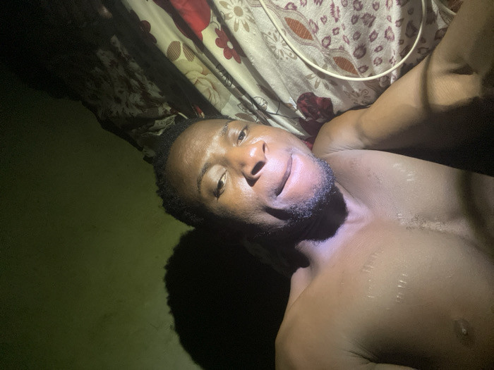 A shirtless man is lying down, facing the camera