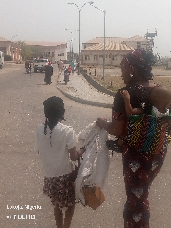 The image presents an outdoor street scene in Lokoja, Nigeria, under daylight conditions with a visible haze