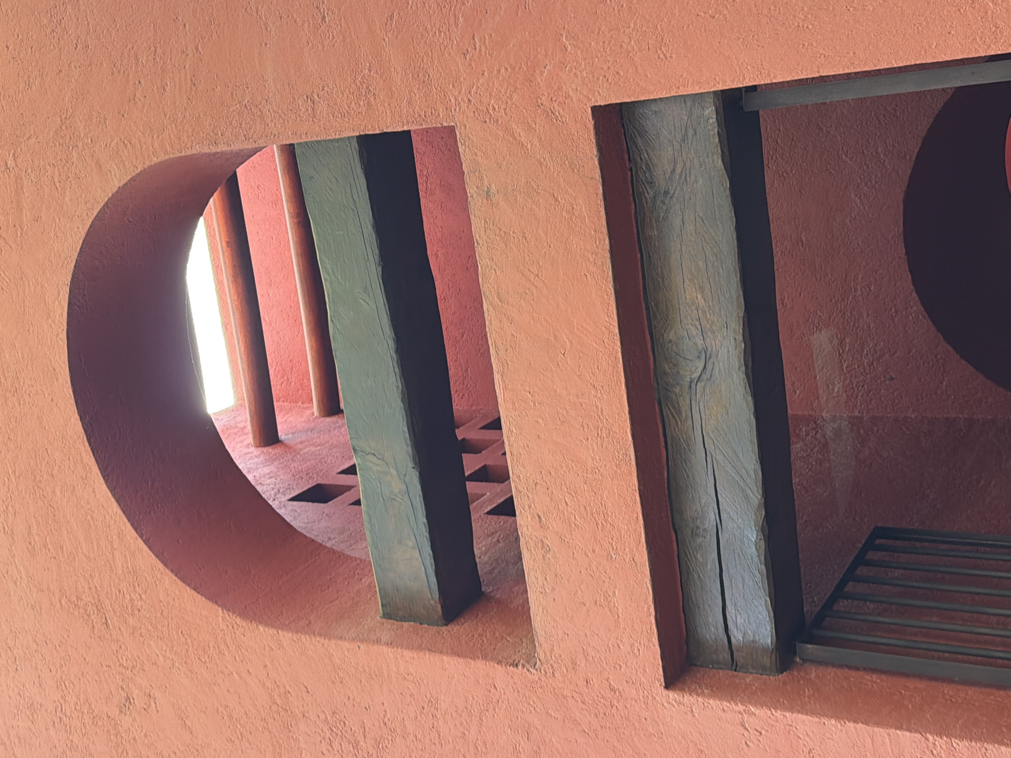 This image captures a close-up view of an architectural feature in what appears to be the city of Puebla, Mexico, based on the architectural style and coloring. The foreground is dominated by a peach-colored, textured wall with two openings. The opening on the left is a smooth, rounded archway, while the one on the right is a square. Both are framed by dark-colored wooden supports. Through the openings, we can see the interior space, where there are cylindrical columns and a reddish-brown floor. The floor has square cutouts. The overall lighting suggests a sunny day.