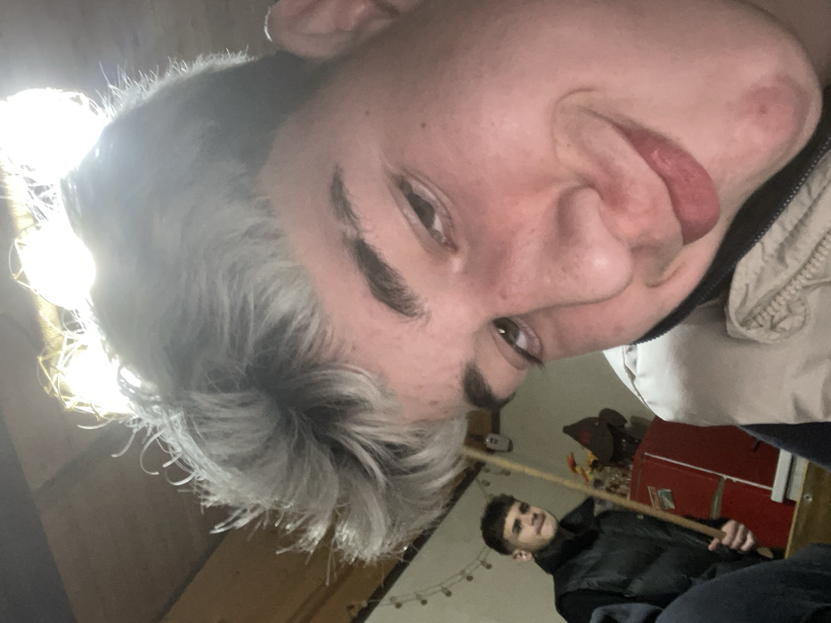 The image captures an indoor scene featuring two young adult males. The primary subject, positioned in the foreground on the right, is a light-skinned male with gray-dyed, textured hair and dark roots. He wears a light-colored puffer vest and displays a subtle smirk, with visible acne or blemishes on his chin. His eyes are directed slightly downward and left. In the upper-left background, a second light-skinned male, with dark, short hair, wears a dark puffer vest and holds a light-colored wooden stick, resembling a pool cue, in his right hand. His gaze is directed towards the camera. The background environment consists of light-colored wooden wall paneling adorned with a string of decorative lights, a white vertical object mounted on the wall, and a red cabinet topped with various decorative items, including a brown statuette. An overhead light source creates significant glare in the upper portion of the frame. The precise location within Botevgrad, Bulgaria, cannot be determined from the visual information provided; the setting appears to be a private indoor space.