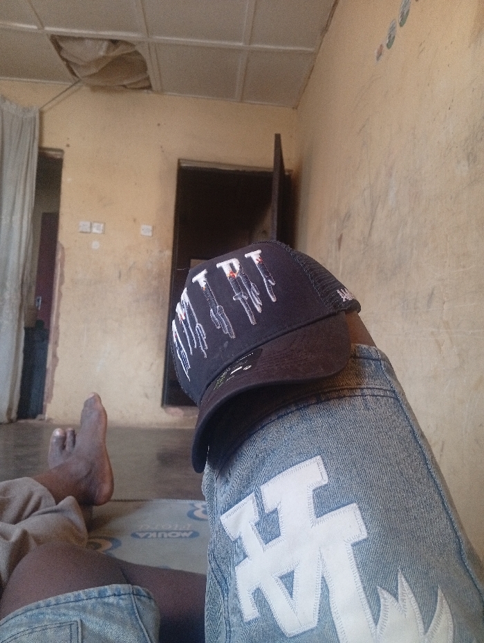 The image captures a person's lower body from a first-person perspective, situated indoors in Barakin Lerawi, Nigeria. The subject exhibits dark skin tone, wearing light-wash denim shorts adorned with a large white "LA" appliqué on the right thigh. A black baseball cap, featuring white graphics and red details, rests on the right leg. The bare left foot is positioned on a blue and white mat or mattress labeled "MOUKA." The surrounding room features light brown, textured walls, a white paneled ceiling with a visible area of damage and sagging material in the upper left, and two dark, open doorways in the background. Two white electrical outlets are mounted on the wall to the left of the doorways.