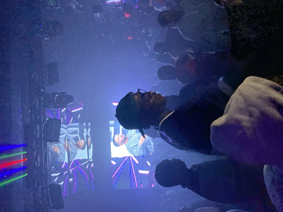 At a concert, an attendee with glasses and a cap stands among a crowd, illuminated by stage lights and fog. Behind them, screens display a performer. Lighting rigs and speakers are visible above the screens, adding to the concert atmosphere. Lasers dance in the air.