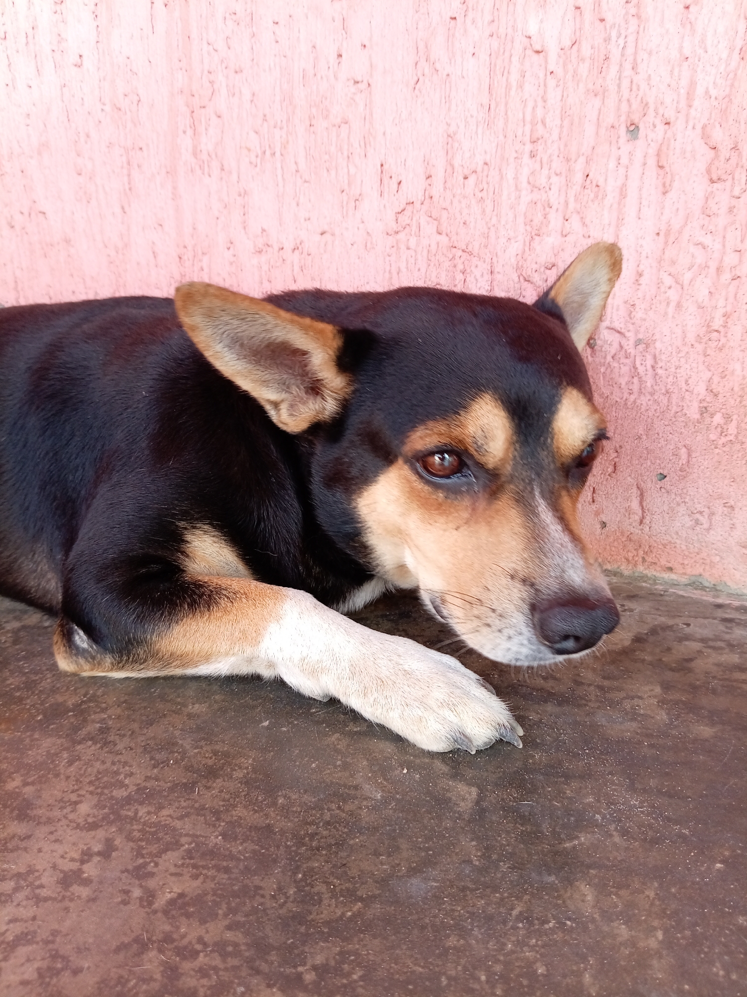 A medium-sized dog lies on a brown surface, its head and forepaws resting towards the lower right of the frame. The dog has short, dark brown fur with tan markings around its face and ears. Its left forepaw is mostly white, with a hint of tan near the top. The dog's expression is pensive, its gaze directed slightly downwards. Behind the dog, there's a rough, textured wall painted in a light pink hue. The setting is Altagracia, Venezuela.