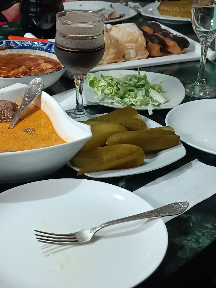 The scene depicts a dining table in Tbilisi, Georgia, laden with food and beverages, viewed from a seated perspective. The dark, reflective tabletop suggests a polished surface, possibly marble or granite. In the immediate foreground, a white, square-edged plate is positioned centrally, hosting a silver-colored fork with an ornate handle, lying across its surface. A small, faint liquid residue is visible on the plate. To the right of this plate, a folded white paper napkin rests on the tabletop. Moving backward from the left, a large, white, boat-shaped serving bowl contains a thick, orange-colored stew or soup, with a silver spoon partially submerged within it. Adjacent to this, on a small, rectangular white plate, are several elongated, olive-green pickled cucumbers. To the right of the pickled cucumbers, a stemmed wine glass, coated with condensation, holds a dark red liquid, indicative of wine. Next to the wine glass, a small, oval white plate contains a serving of shredded green lettuce salad, lightly dressed. Further back and to the right, another stemmed wine glass, appearing empty, stands on the tabletop. Behind the salad and the first wine glass, a white rectangular platter holds two distinct food items: a pale, flaky, square-shaped pastry dusted with white powder, and two dark-brown, glazed pastries resembling eclairs. In the upper left quadrant, partially visible, is a shallow white bowl with blue decorative trim, containing a reddish-brown stew with visible pieces of meat. Further in the background, out of focus, other plates with food remnants are discernible, along with the top portion of a dark bottle, possibly a beverage container. No individuals are visible in the frame; the scene is set for dining.