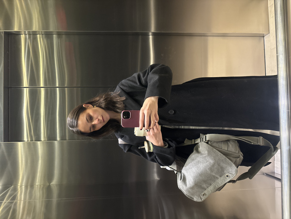 The image depicts a female subject taking a self-portrait inside an elevator. There are no visual cues within the image to determine the specific location within Mexico City. The subject has dark, shoulder-length hair and is wearing a long, dark-colored overcoat. She holds a smartphone with a maroon-colored case in her right hand, positioned towards herself for the photograph. Her left hand holds a light-colored cup with a lid and a straw. A grey canvas messenger bag with a shoulder strap is slung over her left shoulder. The elevator interior features brushed metallic walls, likely stainless steel, and a reflective lower panel, with two closed elevator doors visible directly behind the subject.