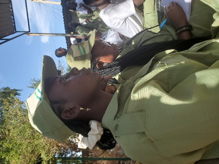 This outdoor photograph, taken in Jos, Nigeria, captures a gathering of individuals, predominantly young adults, under a clear sky. In the immediate foreground on the left, a young Black female is depicted in profile, facing right, wearing a light green National Youth Service Corps (NYSC) uniform cap with white and green insignia, and a light green uniform shirt. Her dark hair is styled back with a white scrunchie, and she wears a gold-colored cross earring in her visible ear. To her right and slightly behind, another young Black female is partially visible, also wearing an NYSC cap and uniform. She has long dark braids, is looking downwards, and is actively writing on a white notepad with a blue pen. She wears multiple dark beaded bracelets on her left wrist. In the midground and background, several other individuals, both male and female, are present; some are also in NYSC uniforms and caps, while others wear white t-shirts. They appear to be seated or standing in a structured arrangement. The environment includes green foliage on the far left, and a metal-framed structure with a corrugated roof is visible on the right side of the frame, beneath a bright blue sky.