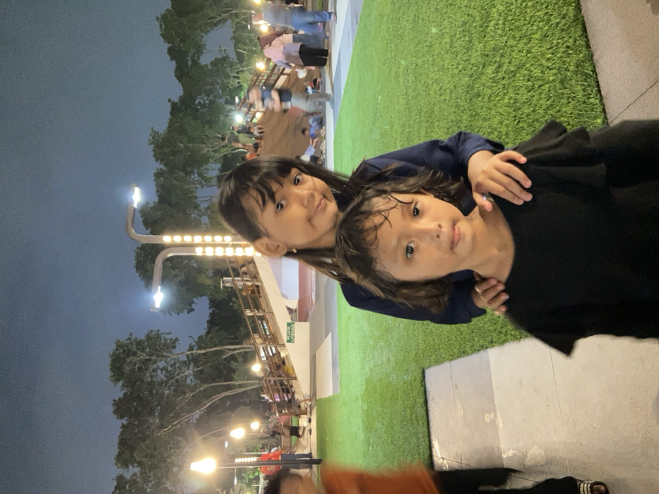 The image depicts a nighttime scene in a public park or plaza within Sidoarjo, Indonesia. In the foreground, two young Asian females are centered. The front subject, a young girl with short, dark, wavy hair, wears a black long-sleeved top with ruffles and looks directly at the camera with a neutral expression. Behind her, a slightly older girl with long, straight dark hair and bangs wears a dark blue long-sleeved top, her hands resting on the front subject's shoulders. She also looks towards the camera, exhibiting a slight smile. They are positioned on a light-colored paved walkway, adjacent to an expanse of artificial green turf. The midground features a prominent white pedestrian bridge with brown railings, illuminated by numerous modern streetlights with bright LED fixtures, some incorporating vertical light strips. Below and around the bridge, various individuals, including adults and children, are visible, either walking on the bridge or congregating on a sloped area next to it. A blurred figure of a child in an orange top is partially visible on the left side of the foreground. The background reveals a dark night sky with silhouettes of trees, beneath which more park visitors are scattered.