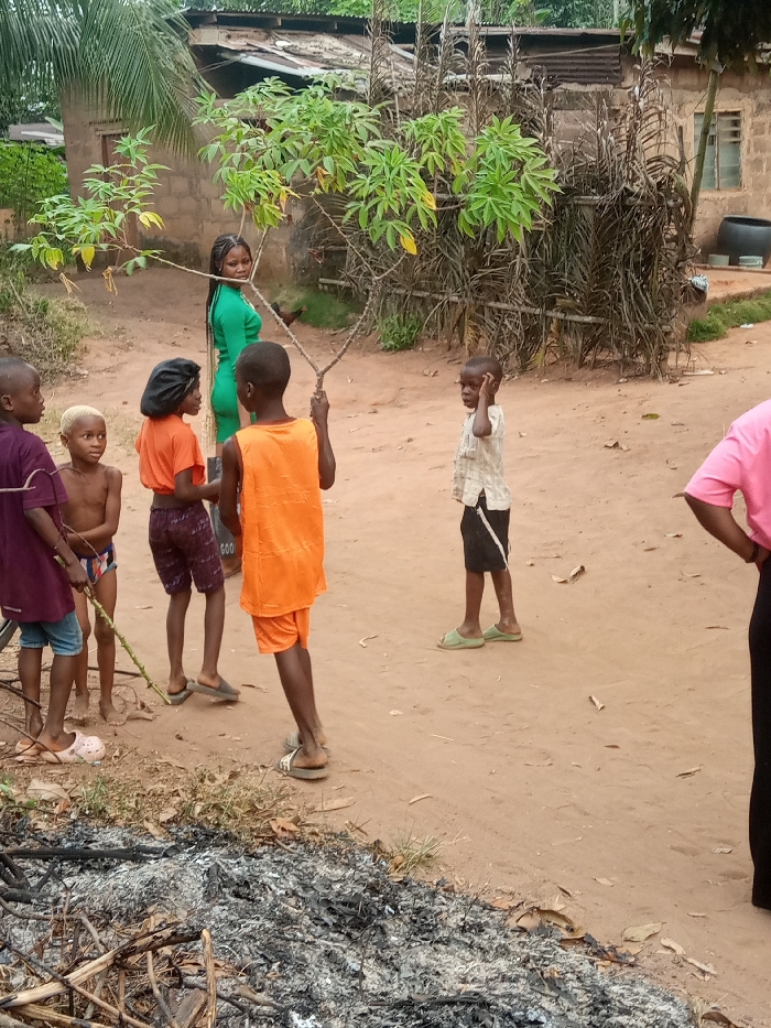 A group of children are standing in a dirt yard near a pile of ash. One child is holding a leafy branch. A woman in a green dress stands nearby. Behind them, a small building with a corrugated metal roof can be seen. The scene suggests a rural or less developed area. One child is holding his head and the child with no shirt is holding a long stick. Another person is standing on the far right in a pink shirt.