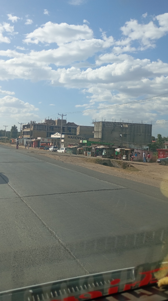 A street scene shows a flat, gray asphalt road receding into the distance under a bright sky dotted with white, puffy clouds. On the right side of the road, there are buildings, some appearing to be under construction, alongside businesses with signage including “HARDWARE”. Makeshift shelters and stalls are set up next to the buildings. People are walking along the side of the road. The scene seems to be captured from inside a vehicle with part of the vehicle's interior visible at the bottom.