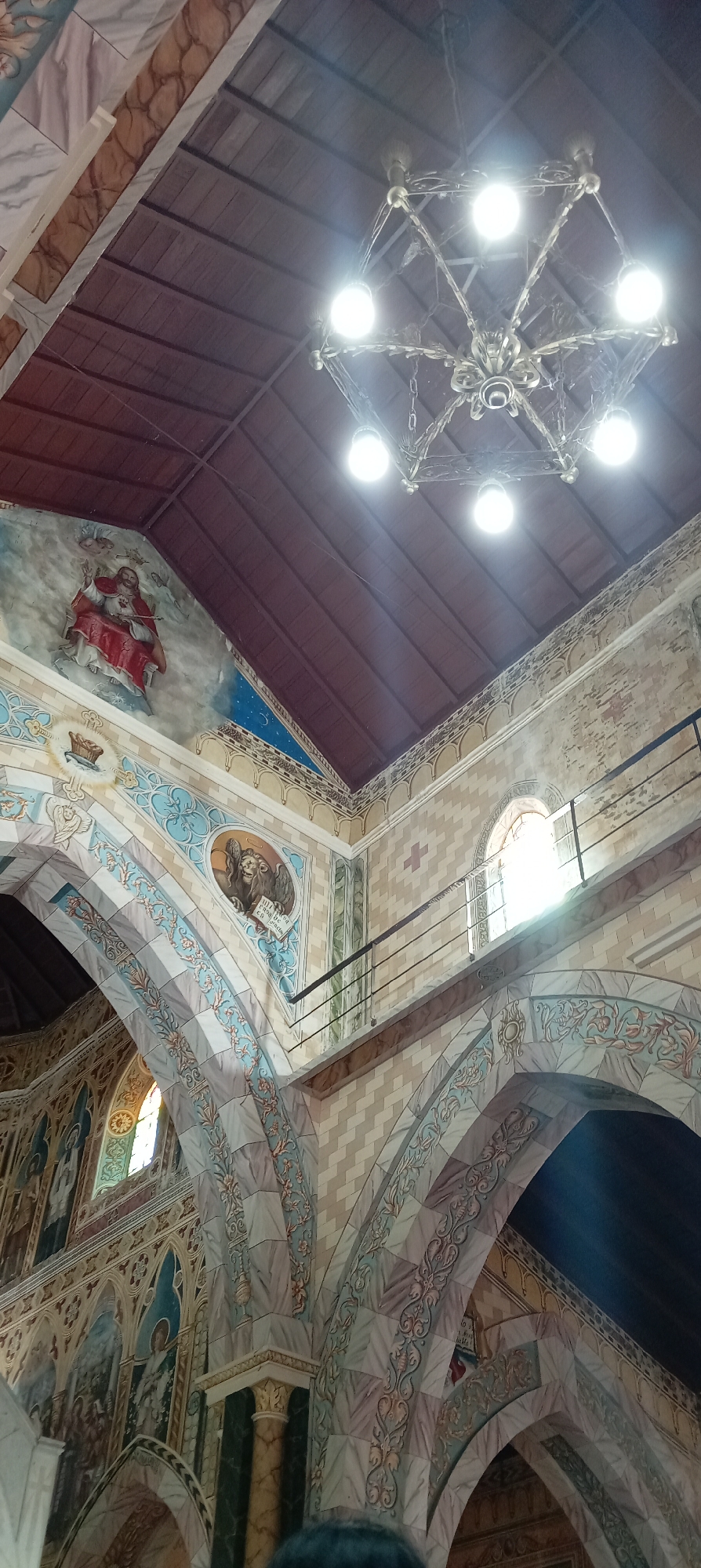 interior of a church, likely the Iglesia Inmaculada Concepción in Tinaquillo, Venezuela, viewed from a low angle. The ceiling is wooden with a dark reddish-brown color and is decorated with painted religious figures and motifs. A chandelier with multiple exposed light bulbs hangs from the center of the ceiling. The walls and arches are elaborately decorated with patterned tiles and painted scenes. A second-story balcony with a metal railing is visible, with a window providing natural light. The lower arches suggest the nave of the church. The overall scene is ornate and religious.