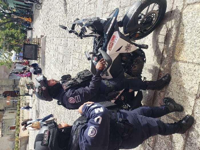 Two uniformed police officers, clad in dark blue attire and tactical gear, sit astride a motorcycle parked on a cobblestone surface. The motorcycle is white with black accents and bears official markings. The officers wear helmets with visors and appear to be observing the surroundings. The background reveals a public square with trees, possibly adorned for a festive occasion. The scene suggests security personnel on duty in a public setting.