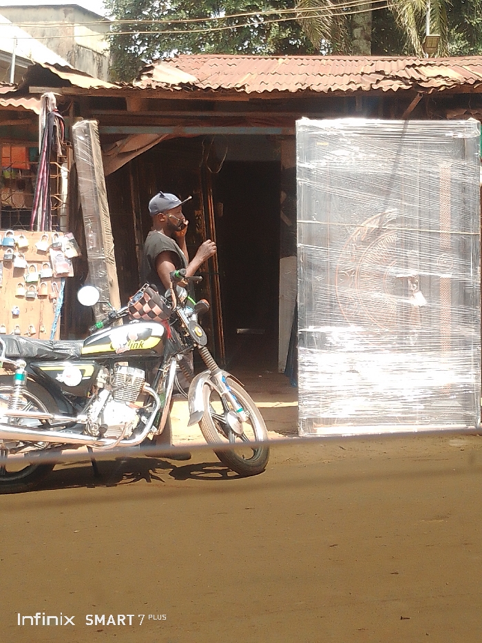 This image depicts an outdoor street scene in Akokwa, Nigeria, under bright daylight conditions. A single male individual stands in the doorway of a commercial building, holding a black smartphone to his right ear, appearing to be on a call. He wears a dark sleeveless shirt and a light-colored baseball cap oriented backward. To his immediate left, a black and yellow "Link" brand motorcycle is parked on an unpaved, light brown surface, leaning on its kickstand. The motorcycle features chrome details on its engine, exhaust, and front fender. A brown and white checkered bag hangs from its handlebars. The building behind the man features a rusty, corrugated metal roof. To the left of the doorway, a vertical display board is visible, adorned with numerous small, multi-colored padlocks. Several tall, rectangular items, possibly door frames or beams, wrapped in clear plastic, lean against the building wall. To the right of the doorway, a large, rectangular security door, intricately designed with a circular motif and fully encased in clear plastic wrap, stands upright. In the background, green foliage from trees and parts of other structures are visible, with overhead power lines or cables traversing the upper section of the frame. Shadows are cast on the ground, indicating a sunny environment.