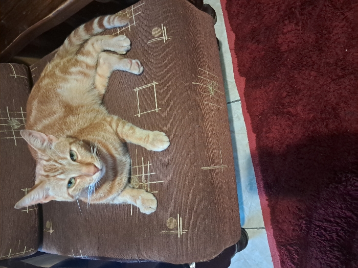 - "An orange tabby cat with green eyes and white whiskers is observed lying on a brown upholstered armchair cushion" by FM-itX5C3, licensed under CC BY 4.0
