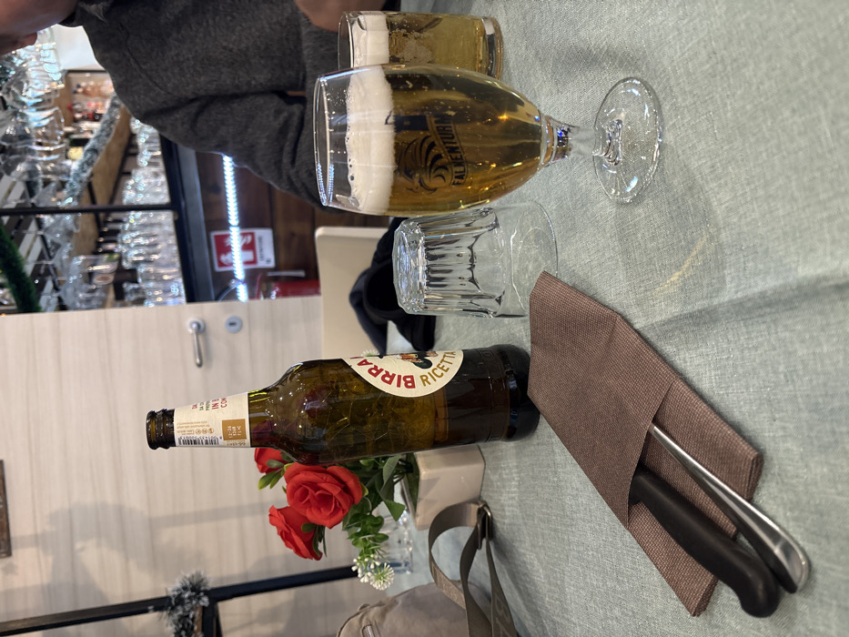 The image depicts a static scene inside a restaurant in Ferrara, Italy, focused on a dining table. The foreground features a light blue/green textured tablecloth. On the table, from left to right, are: a portion of a light grey shoulder bag strap; a small white rectangular planter containing artificial red roses and white flowers; a brown beer bottle, partially consumed, with the label "BIRRA RICCETTA"; a brown textured paper napkin serving as a cutlery holder, containing a black-handled knife and a silver fork; an inverted clear glass tumbler; a stemmed glass filled with light amber beer topped with white foam, bearing the "FALKENTURM" logo; and a second, shorter glass also containing beer, mostly obscured. A person, visible from the chest down, is seated at the table on the right, wearing a dark grey long-sleeved garment. In the background, a bar area is visible with multiple clear drinking glasses hanging and stacked on shelves. Green tinsel decorates the top shelf. To the left background, a light-colored paneled wall features a silver door handle and a keyhole. To the right background, a wooden paneled wall displays a red fire extinguisher and a red emergency exit sign with a white running figure. Overhead lighting is visible above the emergency sign.