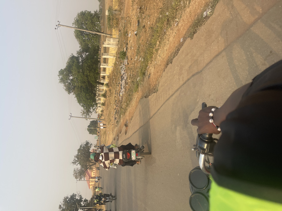 A first-person view from a motorcycle on a road. Several motorcycles and a person in a checkered shawl are ahead. A dilapidated building sits beyond a grassy area, lined with trees and utility poles. The sky is hazy. The viewer's hand with a beaded bracelet grips the motorcycle handle. The road is paved and has a concrete edge.