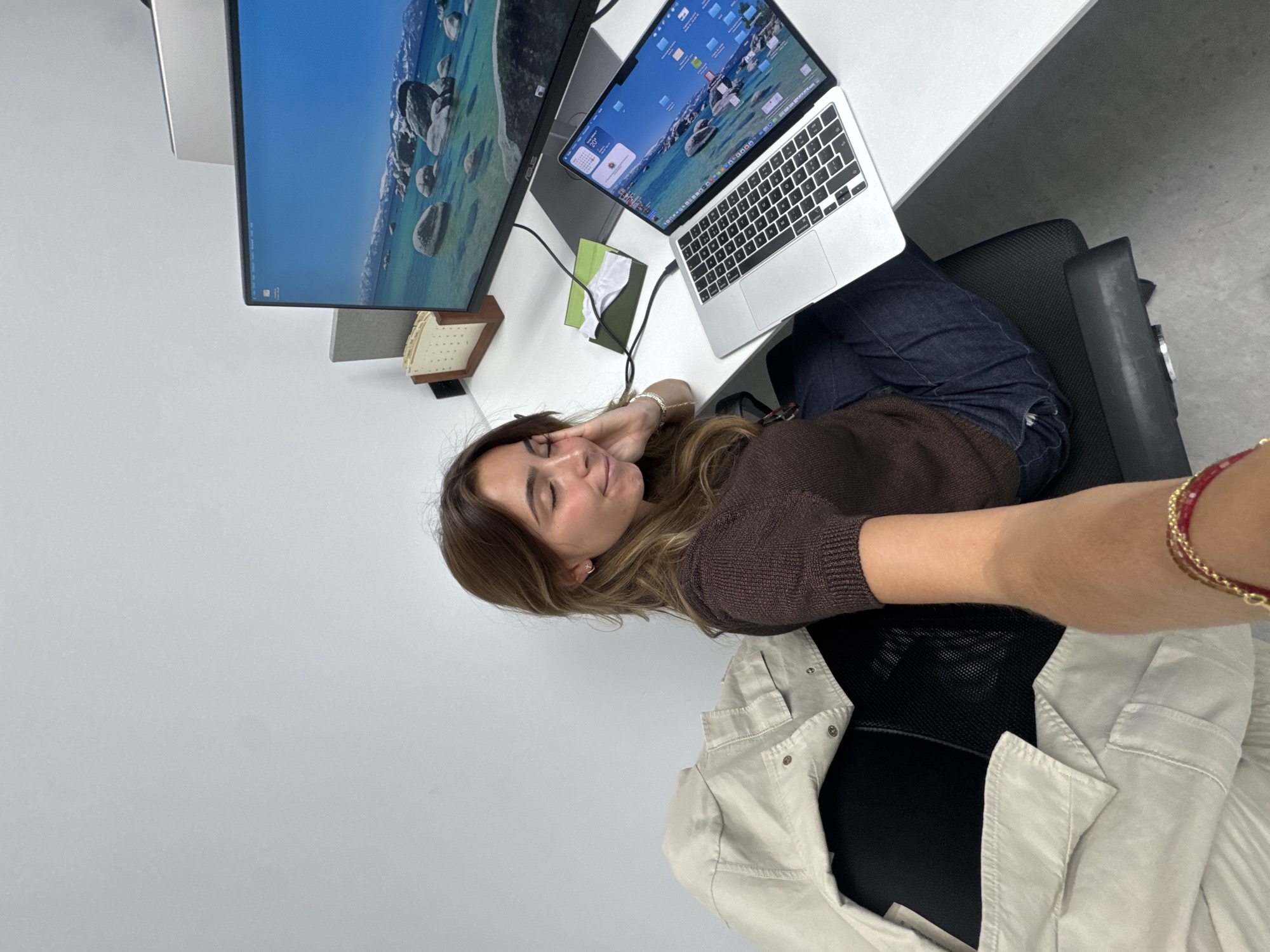The scene depicts an indoor office environment, specified as being in Torres Vedras, Portugal. A single female individual, with long brown hair, is seated at a white desk in a black mesh office chair. She is wearing a short-sleeved brown knitted top and dark blue jeans. Her left hand is resting on her left cheek, and her eyes appear to be closed or partially closed, with a subtle upward curve to her lips. A light-colored, possibly beige or off-white, collared jacket is draped over the back of her chair. The desk setup includes a large black-framed monitor displaying a desktop wallpaper of a lake with rocks and snow-capped mountains. To its right, a silver laptop is open, angled towards the viewer, also displaying a similar landscape wallpaper, numerous desktop icons, and a weather widget showing "26°C". A dark cable connects the laptop to the monitor. A small, dark green rectangular object, possibly a folded case or cloth, is situated between the laptop and the monitor base. A wooden desk organizer containing what appears to be a calendar is visible behind the monitor. The foreground shows the lower part of a human arm, presumably belonging to the photographer, extending into the frame from the bottom right. This arm wears a multi-strand bracelet with gold and red elements. The background consists of a plain white wall.